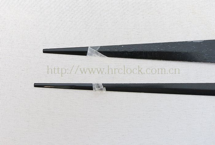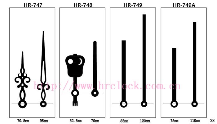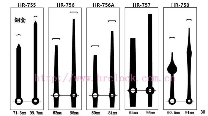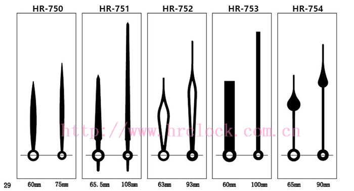 恒荣钟针适用于各品牌钟机芯使用如精工机芯、太阳机芯、恒荣钟机芯、伟盈机芯等等,钟针的孔形有圆孔和方孔多种。恒荣钟表钟针的材质有铜料、铝料和塑胶3种材质,金属钟针厚度分别有0.4至1.0mm,塑胶钟针的厚度在1.5至2.0mm,金属钟针普遍使用的都是0.4mm的厚度,0.4mm的厚度在一般的钟表完全可以满足要求了,十字绣钟针款式有花针和直针两种比较多用,长针不建议超过0.5mm的厚料因为这样会对机芯有一定的影响寿命和走时的准确度。 恒荣钟针长度计量方法是从钟孔的中心点量起,而不是整一支钟针的长度,因为这样的量法是根据钟盘的大小半径快速知道这钟要用多长的钟针。 恒荣钟表生产的钟针颜色非常多,常用的颜色有黑色、白色、红色、银色、金色,如果亲们对颜色要求严格时请在订购下单时提供你的颜色色号或色板,这样我们可以高效地为亲们服务避免钟针颜色上的色差。