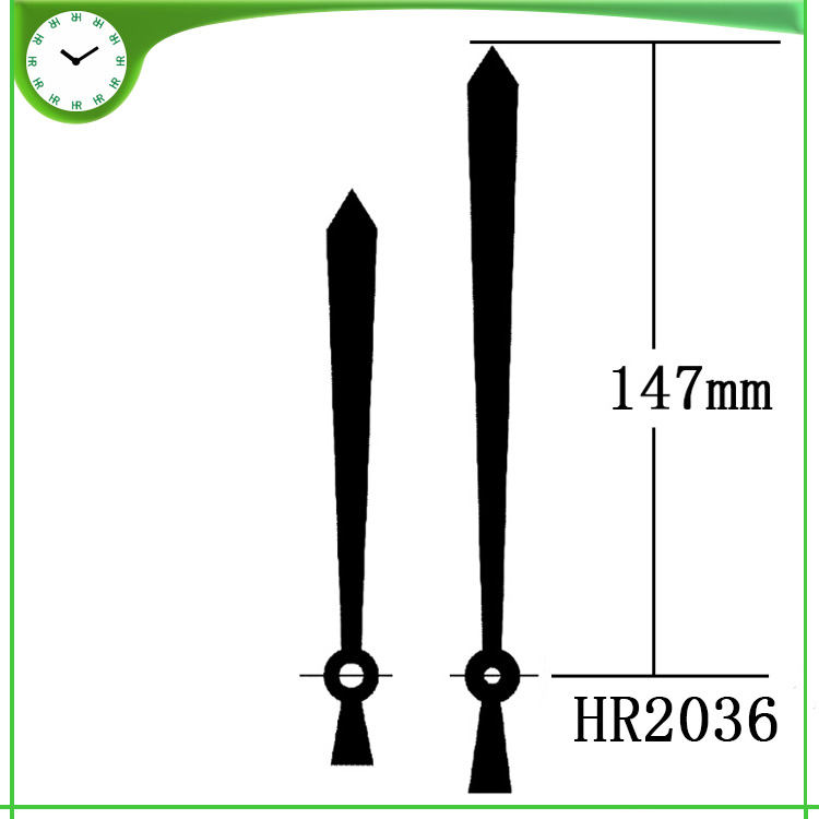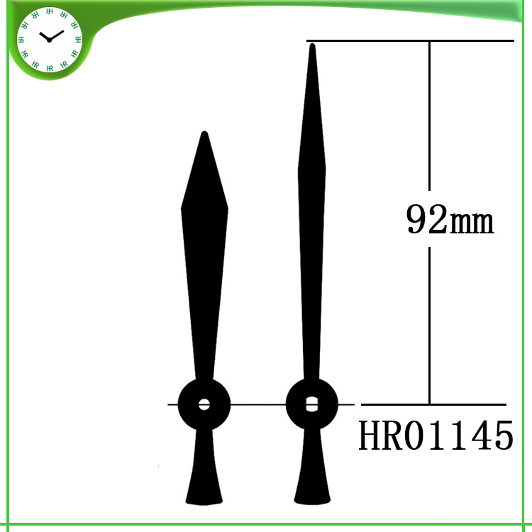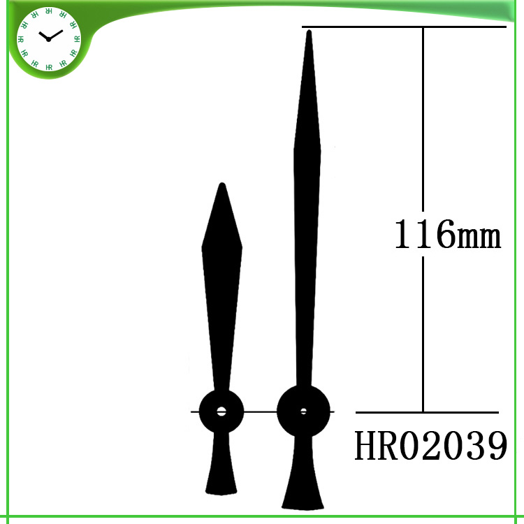 恒荣钟表1999年开始对【钟表配件钟针】的研发和生产,创新了钟针行业的多次记录,恒荣钟表在这些年来不断的研发和创新中公司现拥有2000多不同款式形状钟针模具,款式新怡得到钟表行业、工艺装饰品行业和艺术品行业等等的应用和好评,恒荣钟针对各品牌钟机芯适用面广 如精工机芯、太阳机芯、恒荣钟机芯、伟盈机芯等等,钟针的孔形有圆孔和方孔多种。恒荣钟表钟针的材质有铜料、铝料和塑胶3种材质,金属钟针厚度分别有0.4至1.0mm,塑胶钟针的厚度在1.5至2.0mm,金属钟针普遍使用的都是0.4mm的厚度,0.4mm的厚度在一般的钟表完全可以满足要求了,长针不建议超过0.5mm的厚料因为这样会对机芯有一定的影响寿命和走时的准确度。 恒荣钟针长度计量方法是从钟孔的中心点量起,而不是整一支钟针的长度,因为这样的量法是根据钟盘的大小半径快速知道这钟要用多长的钟针。 恒荣钟表生产的钟针颜色非常多,常用的颜色有黑色、白色、红色、银色、金色,如果亲们对颜色要求严格时请在订购下单时提供你的颜色色号或色板,这样我们可以高效地为亲们服务避免钟针颜色上的色差。