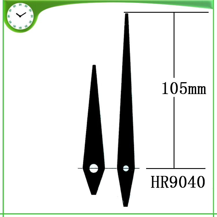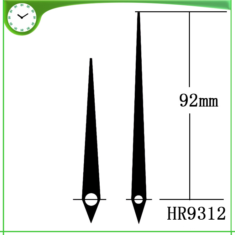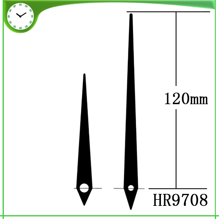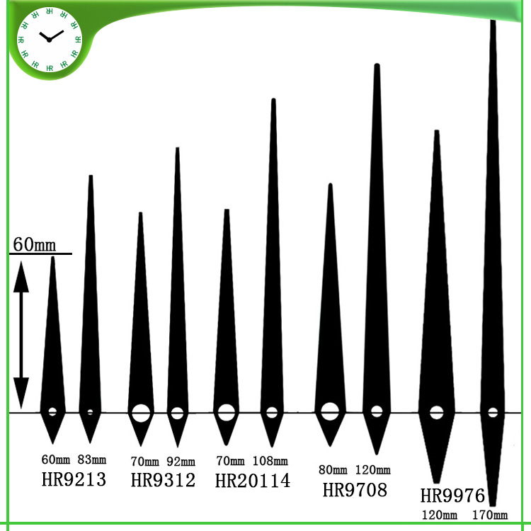 恒荣钟表1999年开始对【钟表配件钟针】的研发和生产,创新了钟针行业的多次记录,恒荣钟表在这些年来不断的研发和创新中公司现拥有2000多不同款式形状钟针模具,款式新怡得到钟表行业、工艺装饰品行业和艺术品行业等等的应用和好评,恒荣钟针对各品牌钟机芯适用面广 如精工机芯、太阳机芯、恒荣钟机芯、伟盈机芯等等,钟针的孔形有圆孔和方孔多种。恒荣钟表钟针的材质有铜料、铝料和塑胶3种材质,金属钟针厚度分别有0.4至1.0mm,塑胶钟针的厚度在1.5至2.0mm,金属钟针普遍使用的都是0.4mm的厚度,0.4mm的厚度在一般的钟表完全可以满足要求了,长针不建议超过0.5mm的厚料因为这样会对机芯有一定的影响寿命和走时的准确度。 恒荣钟针长度计量方法是从钟孔的中心点量起,而不是整一支钟针的长度,因为这样的量法是根据钟盘的大小半径快速知道这钟要用多长的钟针。 恒荣钟表生产的钟针颜色非常多,常用的颜色有黑色、白色、红色、银色、金色,如果亲们对颜色要求严格时请在订购下单时提供你的颜色色号或色板,这样我们可以高效地为亲们服务避免钟针颜色上的色差。