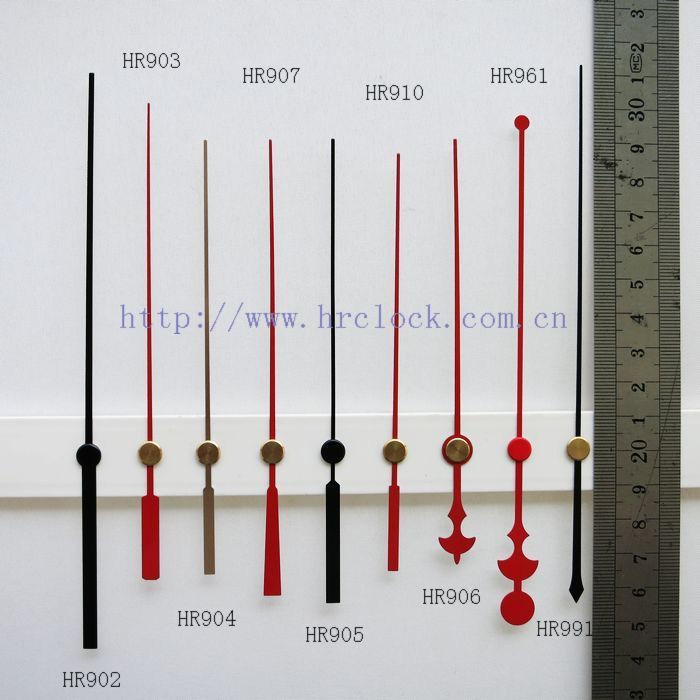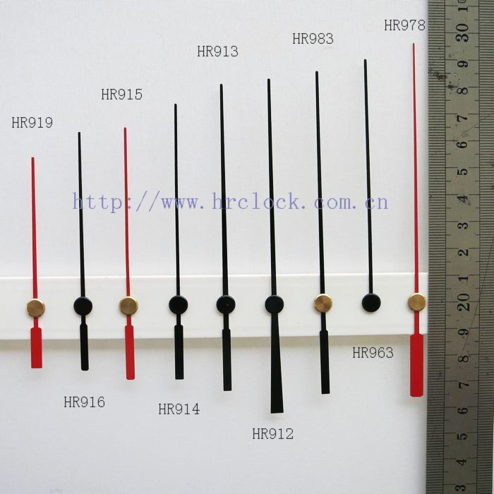 恒荣钟表1999年开始对【钟表配件钟针】的研发和生产,创新了钟针行业的多次记录,恒荣钟表在这些年来不断的研发和创新中公司现拥有2000多不同款式形状钟针模具,款式新怡得到钟表行业、工艺装饰品行业和艺术品行业等等的应用和好评,恒荣钟针对各品牌钟机芯适用面广 如精工机芯、太阳机芯、恒荣钟机芯、伟盈机芯等等,钟针的孔形有圆孔和方孔多种。恒荣钟表钟针的材质有铜料、铝料和塑胶3种材质,金属钟针厚度分别有0.4至1.0mm,塑胶钟针的厚度在1.5至2.0mm,金属钟针普遍使用的都是0.4mm的厚度,0.4mm的厚度在一般的钟表完全可以满足要求了,长针不建议超过0.5mm的厚料因为这样会对机芯有一定的影响寿命和走时的准确度。 恒荣钟针长度计量方法是从钟孔的中心点量起,而不是整一支钟针的长度,因为这样的量法是根据钟盘的大小半径快速知道这钟要用多长的钟针。 恒荣钟表生产的钟针颜色非常多,常用的颜色有黑色、白色、红色、银色、金色,如果亲们对颜色要求严格时请在订购下单时提供你的颜色色号或色板,这样我们可以高效地为亲们服务避免钟针颜色上的色差。