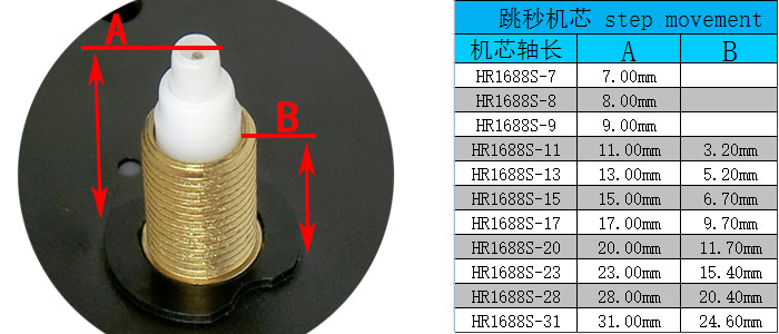 机芯尺寸:无挂钩款56*56*16mm、一体挂钩款69*56*16mm;轴长选择: