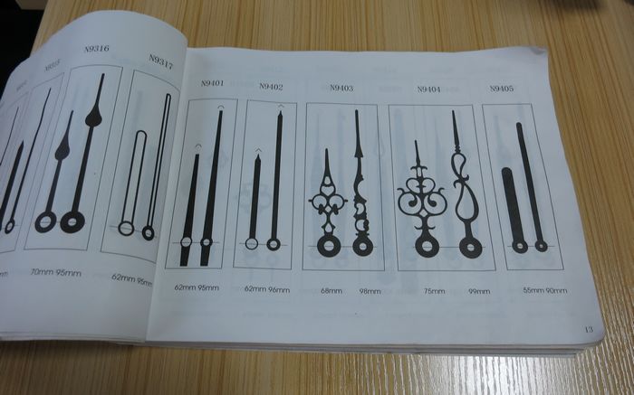 批发采购挂钟钟针就找恒荣钟表厂家批发款式最新,形状最全,2000多款钟针供你选择。如果你怕挑选耗时费劲,请提供你的挂钟设计图片让我们来帮你找同款同形钟针,没有挂钟设计图片也不关事,大致描述一下你的挂钟钟面尺寸和字体以及达到什么样的效果,我们会提供相关的钟针款式让你来选择确认。